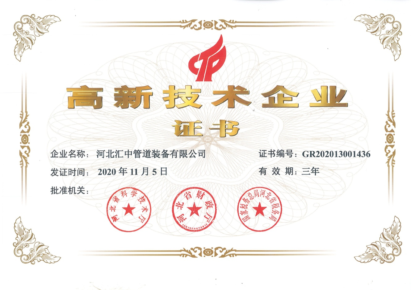 2020年11月5日,河北匯中管道裝備有限公司順利完成高新換證,再次取得國家級高新技術企業證書。